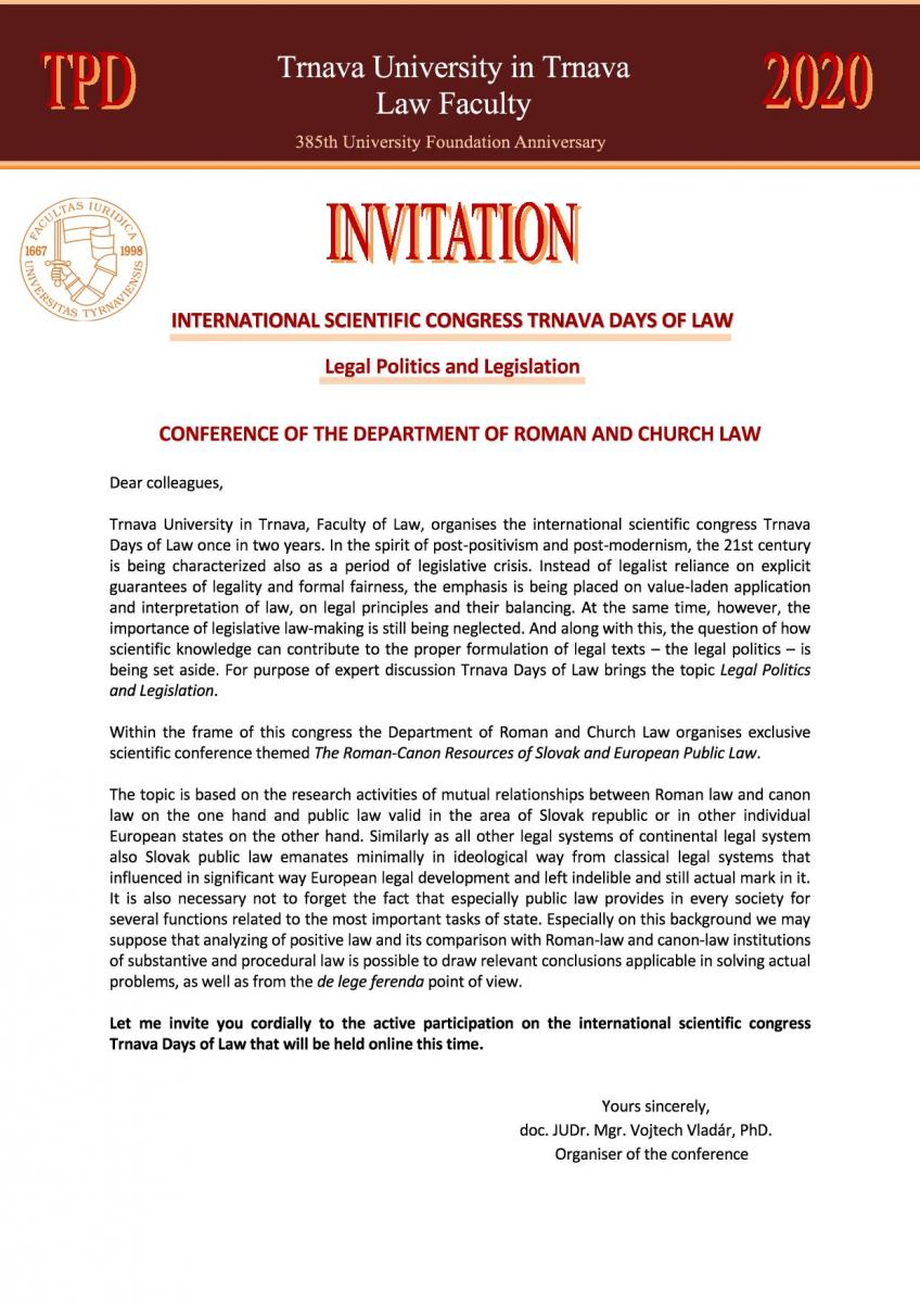 CONFERENCE OF DEPARTMENT OF ROMAN AND CHURCH LAW - "The Roman-Canon Resources of Slovak and European Public Law"